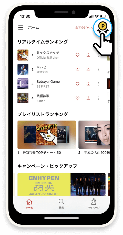 ※はじめての入会から30日間以内のみ対象 / 曲やアルバム、プレイリストをオフライン設定後、マイページ>オフライン再生モードをONにする