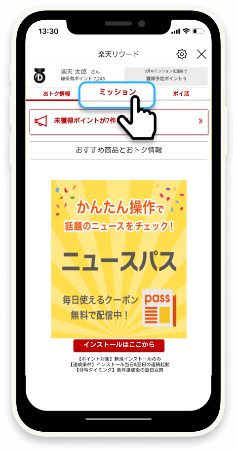 最初に「おトク情報」の画面が表示されます。「ミッション」をタップしてください。