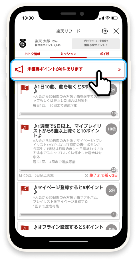 ミッション一覧が表示され、ミッションの詳細を確認できます。 一覧の一番上にある「未獲得ポイントが8件あります」をタップしてください。