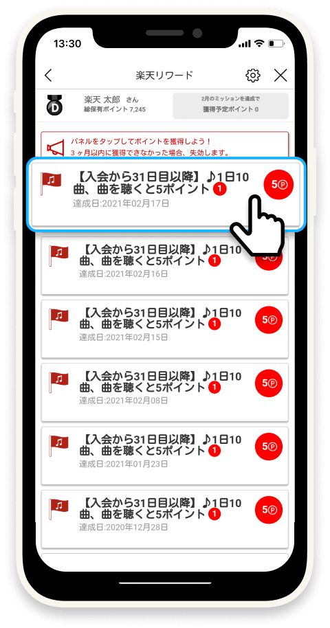 1.1日1曲再生で1ポイント(毎日1回達成可能)