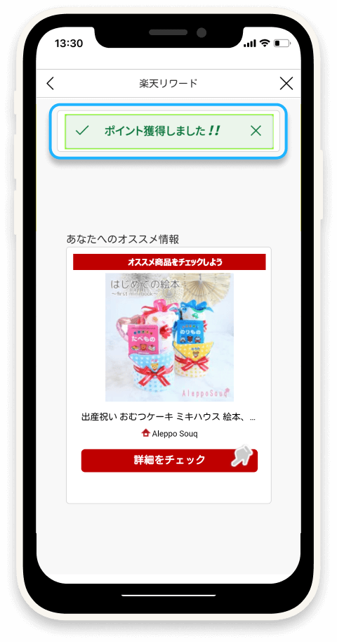 「ポイント獲得しました!!」と表示されたらポイント獲得完了です。